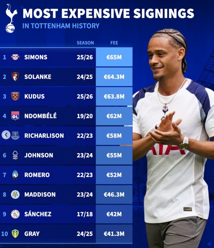 9月5日讯 热刺主席列维官宣离任,《转会市场》也统计了他执掌热刺期间的最贵引援情况,孙兴慜未进入前十。
