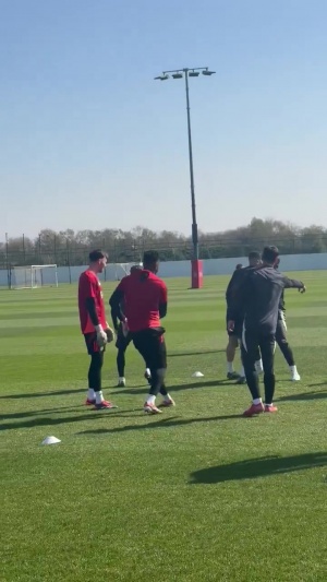 体育资讯04月09日讯 曼联将于本周五迎来与里昂的欧联杯1/4决赛首回合比赛,媒体晒出了今日曼联的训练视频。视频中,奥纳纳抱摔放倒加纳乔,几人有说有笑,心情不错。