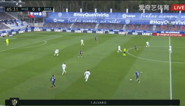 48'韦斯卡右路发起快攻,冈崎慎司横传到远端,哈维·加兰左脚爆射破门,韦斯卡1-0主场领先皇马!
